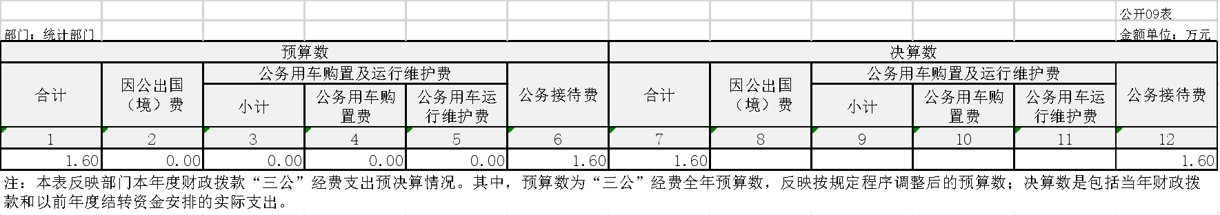2024年度财政拨款安排的“三公”经费支出1.60万元,完成年初预算的160%,比上年增0.33万元,主要原因是2024年自治区统计局到玉林市开展统计执法“双随机”检查、数据质量核查、全国第五次经济普查督导、新型农业经营主体调查试点以及专业处调研等,导致增加了相应的业务接待费用。其中:因公出国(境)费支出决算0万元,公务用车购置及运行费支出决算0万元,公务接待费支出决算1.60万元。